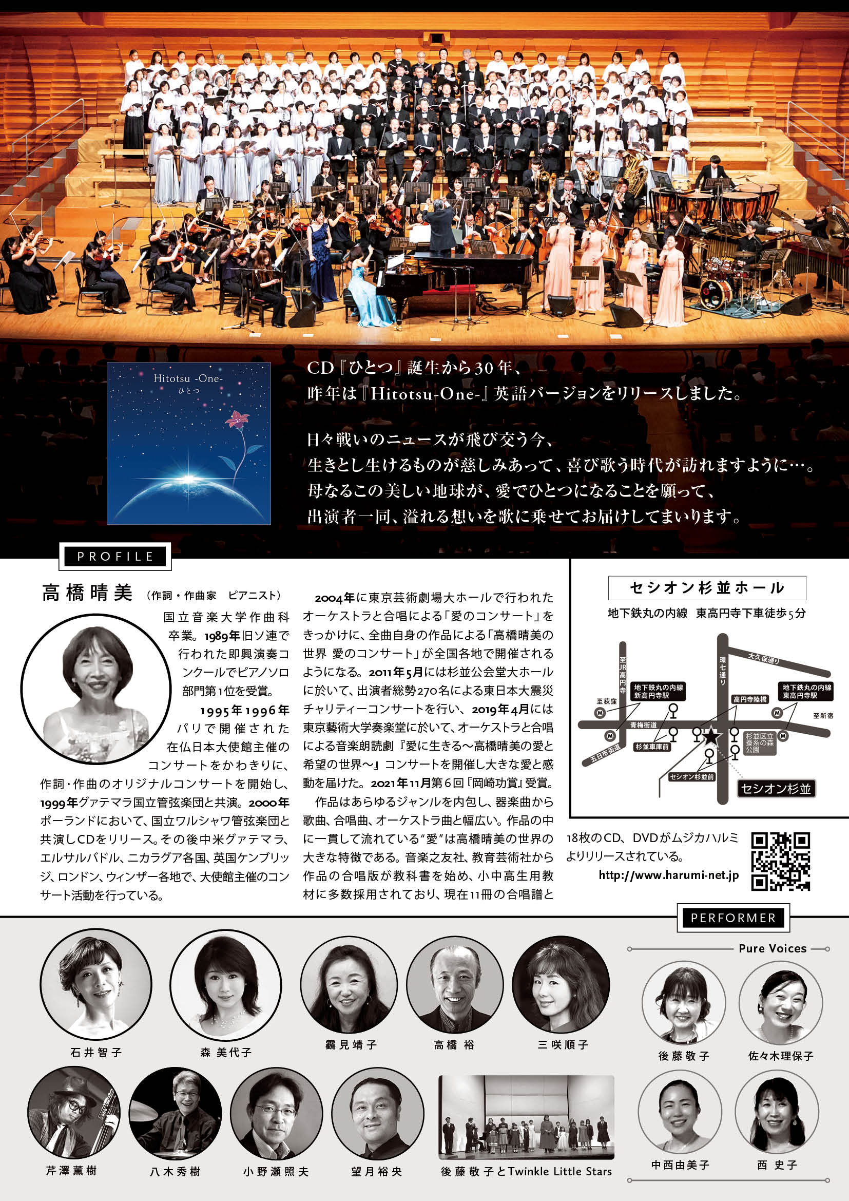今回、是非コンサートで皆様にお聴かせしたい!!そして、昨年『ひとつHitotsu- one』(123番を日本語4番を英語)で見事に歌い上げてくださった森美代子さんはじめ、CD『祈り』の中で『ひとつHitotsu- one』を愛を込めて歌ってくださった靏見靖子さんや、Pure Voicesの方々、そして合唱団とオーケストラの方々と共に、平和への切なる祈りを乗せて日本語と英語で世界に向けて発信したい!!と熱い想いで準備しております。