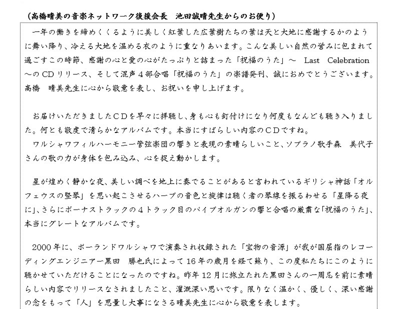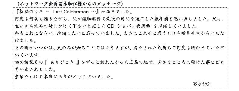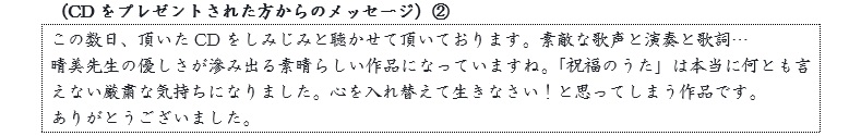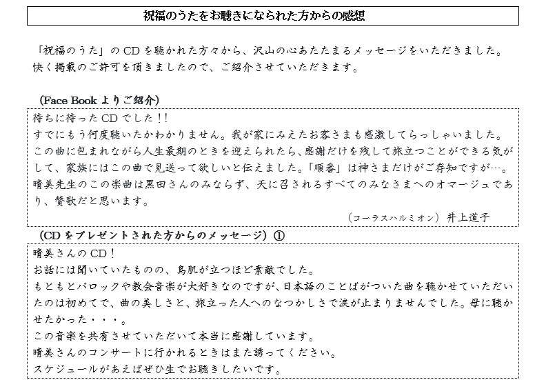 頂きました。しかし、先生の曲が如何に皆様の心にしみる物だと改めて強く思えたと同時に、身が引き締まり、これからもっと自分自身の内面を見つめたいと強