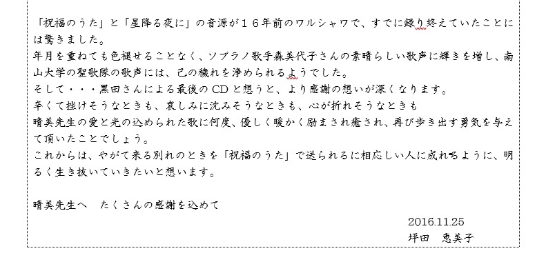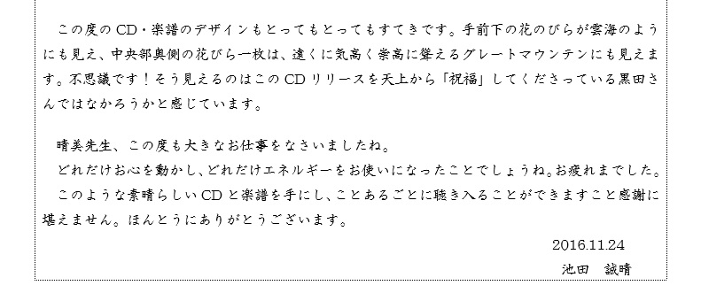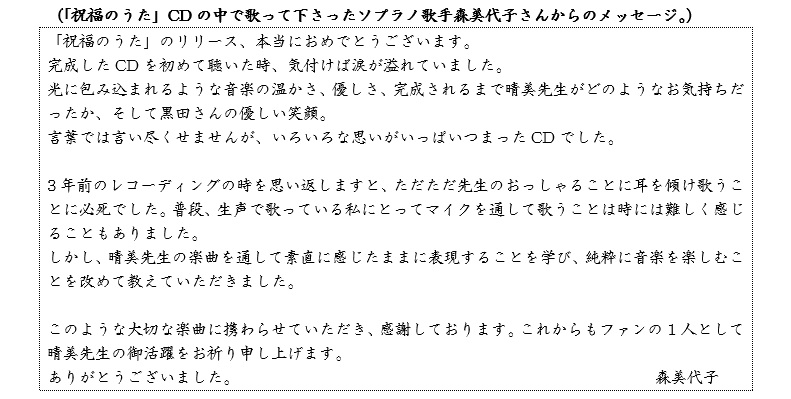 は遂に、黒田さんの最後のスタジオワークとなった「祝福のうた」のCDと共に楽譜を同時にリリースする事が出来ました。