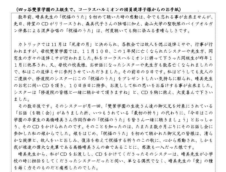届いた1通の年賀状がきっかけとなり、「祝福のうた」のジャケットのデザインを思い立ち、その後3月には、8年前に聖歌隊南山大学スコラ・カントールムに