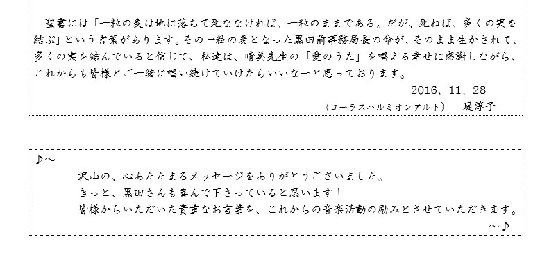 ちに、いつの間にか心の中は温かな愛と感謝に満ちておりました。この間、どれほど皆様のあたたかな真心に支えられた事でしょう…。黒田さんの大きな後押し